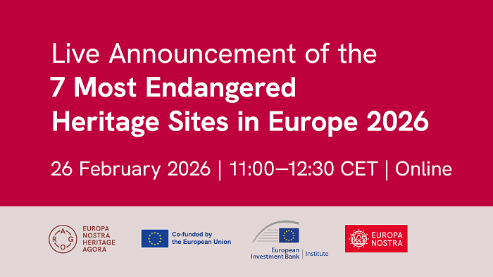A muito aguardada lista final dos 7 sítios mais ameaçados de 2026 será revelada durante este evento online, que contará com a participação de representantes da Europa Nostra, do Instituto do Banco Europeu de Investimento e da Comissão Europeia.