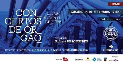 Temos o prazer de o convidar para o concerto de órgão pelo organista Robert Descombes na Igreja de São Vicente de Fora. Este é o primeiro da segunda série de concertos regulares a realizar até Dezembro deste ano. Construído em 1756 por João Fontanes de Maqueira e restaurado em 1994 por Claudio e Christine Rainolter, o órgão da Igreja de São Vicente de Fora, em Lisboa, é um dos maiores e mais importantes instrumentos históricos de toda a Península Ibérica. Os concertos regulares de órgão em São Vicente de Fora realizam-se aos segundos sábados de cada mês, pelas 17h00. O primeiro da segunda série destes concertos acontece já no próximo dia 14 de Setembro. Entrada livre. Reservas e informações para 218 810 500 (Patriarcado), 919 745 338 e info@althum.com