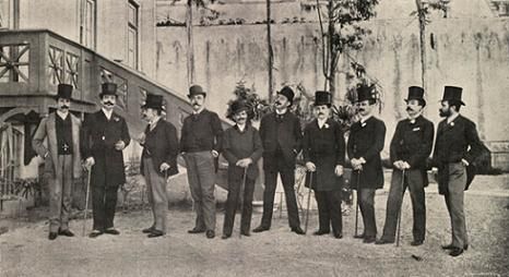 Mas vamos às refeições, na maior parte dos casos jantares. Sigamos a sua cronologia. Os convivas iniciais teriam sido os parlamentares das duas câmaras – Ficalho, Oliveira Martins, Carlos Lobo d’Ávila e António Cândido Ribeiro da Costa. O primeiro de todos os ágapes foi no restaurante Tavares e seguiu-se ao discurso do Conde de Ficalho na Câmara dos Pares de 28 de junho de 1888, em que se denunciava a inaceitável paralisia da vida política. Logo em julho de 1888, Oliveira Martins, nas colunas de «O Repórter»: perguntava: «Por que não haverá um jantar semanal, um jantar alegre e até um bom jantar, a carta constitucional de um partido novo?». Mas, a que se deve a designação de «Vencidos da Vida»? O autor de «Os Filhos de D. João I», ao ouvir, nesses dias, o seu vizinho do terceiro andar da Calçada dos Caetanos, Ramalho Ortigão, ler uma descrição sobre a voga parisiense dos jantares, achou que podia usar o exemplo. À semelhança do caso então referido da Villa de Médicis – «les uns glorieux, les autres battus de la vie» – eis que o historiador considera ser uma boa ideia para o novo grupo: Vencidos da Vida… Aos parlamentares, seguiram-se os literatos (Ramalho, Eça de Queiroz e Junqueiro) e depois os palacianos, próximos do Príncipe D. Carlos (Bernardo Pindela, Sabugosa, Soveral e Mayer). Esclareça-se que é o grupo alargado que está em causa, nos jantares de 1889. E é o «Tempo», jornal de Carlos Lobo de Ávila, que nos permite fazer o seu elenco. Em 16 de fevereiro de 1889, juntam-se oito em casa de Bernardo Pindela (Ficalho, Sabugosa, Ramalho, Oliveira Martins, António Cândido, Carlos Mayer e Lobo de Ávila). Em 11 de março, há jantar no Hotel Braganza. A 20, «os vencidos» encontram-se no mesmo hotel para acolher Luís de Soveral, chegado de Londres, onde era 1º secretário da Legação portuguesa. Em 26 de março, ainda no Braganza, recebem Eça de Queiroz, vindo de Paris, tendo Guerra Junqueiro justificado a falta, por se encontrar no Minho, com o envio dois alexandrinos. Em 29, foi a vez de Carlos Mayer oferecer jantar em sua casa, a que também não compareceu Junqueiro… Neste caso, houve música, tendo Ramalho e António Cândido tocado rabeca e todos seguido para o S. Carlos, onde se cantava o «Otelo» de Verdi. Mas voltemos à lista: a 10 de abril, encontraram-se no Tavares e no dia 2 de maio regressaram a S. Domingos, à Lapa, para almoçar na casa de Bernardo Pindela. Na semana seguinte, a 9, o regenerador António Serpa Pimentel foi convidado pelo grupo, no Braganza (o que causou grande vozearia e especulação política). No dia seguinte, Jorge O’Neill convidou para sua casa, tendo faltado Junqueiro, Pindela e Cândido. Em 14 de maio, houve jantar em casa do Conde de Valbom, com a presença de Junqueiro, Eça e Oliveira Martins, Pindela e Alberto Braga. A 17 de maio, celebraram-se os 29 anos de Carlos Lobo de Ávila, em casa de seu pai, o Conde de Valbom, onde foi cantado, com versos de Sabugosa, o hino humorístico do grupo, com música da «Rosa Tirana». Por fim, a 21 de maio, houve novo jantar em S. Domingos, à Lapa, a que faltaram Ficalho e Sabugosa. Esta é a lista coeva, tudo apontando, assim, para que tenha sido 2 de maio de 1889 o dia em que o fotógrafo Augusto Bobone (1852-1910) realizou as fotografias que chegaram até nós, nas quais apenas falta António Cândido. Há, pois, só uma fotografia, realizada em estúdio, com a equipa completa dos onze membros, de que não temos indicação quando foi realizada em 1889.