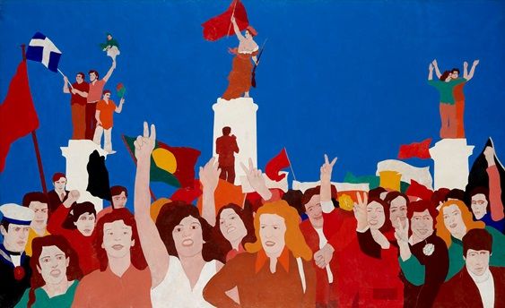 Continuando a percorrer a magnífica exposição, encontramos em “caixas negras” estrategicamente colocadas a lembrança dos tempos que passam quando os artistas criam as peças apresentadas: E devemos ainda lembrar outros nomes: António Palolo, John Furnival, Manuel Baptista, Joaquim Bravo, Ana Vieira, Lourdes de Castro, René Bértholo, Ana Hatherly, Hein Semke, Cruz-Filipe, António Sena, Fernando Calhau, Sá Nogueira ou José Rodrigues… A exposição merece uma atenção especial e ficará na memória do público como uma riquíssima reflexão sobre um diálogo cosmopolita que tem Portugal em fundo. Se nos lembramos de Nikias Skapinakis em “Delacroix no 25 de Abril em Atenas” reportamo-nos a uma invocação sentida e inteligente do nosso Maio de 1968 – que foi a “revolução dos cravos” e que iniciou uma nova vaga das democracias. Na Gulbenkian estão duzentas e quinze obras, das quais vinte inéditas. Como Teresa Magalhães afirma, a propósito de uma obra emblemática sobre a viagem num Mini até Torremolinos, aquilo era a realidade. Não foi inventado. É o quotidiano, usado como motivo para combater o tédio. Aquela viagem significou ir para fora, ver outro lado das coisas. Eis a verdadeira metáfora que está subjacente a esta exposição – era preciso ver o outro lado das coisas, era isso que significava superar o que era vulgar, mesmo que, para desconstruir, fosse necessário partir do que os outros faziam… A curadoria de Ana Vasconcelos e Patrícia Rosas é de uma grande competência técnica, artística, e histórica. Pegando num tema que exigia criatividade e imaginação, capacidade de relacionamento e elevado sento crítico – é-nos apresentada uma mostra que nos leva até aos anos sessenta e setenta, numa perspetiva de conjunto, compreendendo a complexidade social e histórica, e lembrando os cinquenta anos do Maio de 1968, para além do lugar comum…