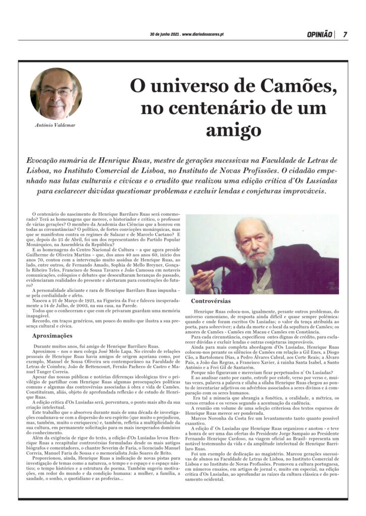 Henrique Barrilaro Ruas, sempre coerente com os seus ideais monárquicos, como, aliás, Gonçalo Ribeiro Telles ou João Camossa Saldanha, foi fiel aos fatores democráticos na formação de Portugal. Daí a sua defesa de uma sociedade aberta, baseada nas raízes tradicionais do municipalismo e do comunalismo. Agradecemos a António Valdemar a justa homenagem.