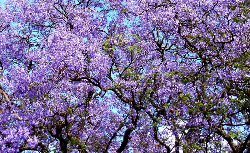 Jacarandá – o nome indígena tupí-guaraní revela a origem exótica desta árvore da América do Sul. É uma árvore de pequeno porte, alcançando cerca 15 m de altura. O caule é um pouco retorcido e a copa é arredondada e irregular, arejada e rala, perdendo a folhagem no inverno. Os seus frutos são verdadeiras cápsulas de madeira, com formato semelhante a conchas que, quando maduras, libertam centenas de sementes aéreas. Floresce em maio e junho, embora possa fazê-lo de forma extemporânea fora destes limites, apresentando flores perfumadas e grandes, de coloração azul ou arroxeada, em forma de trompete. É muito utilizada na ornamentação de ruas, praças e parques, uma vez que as suas raízes aprumadas e profundas não danificam a calçada.